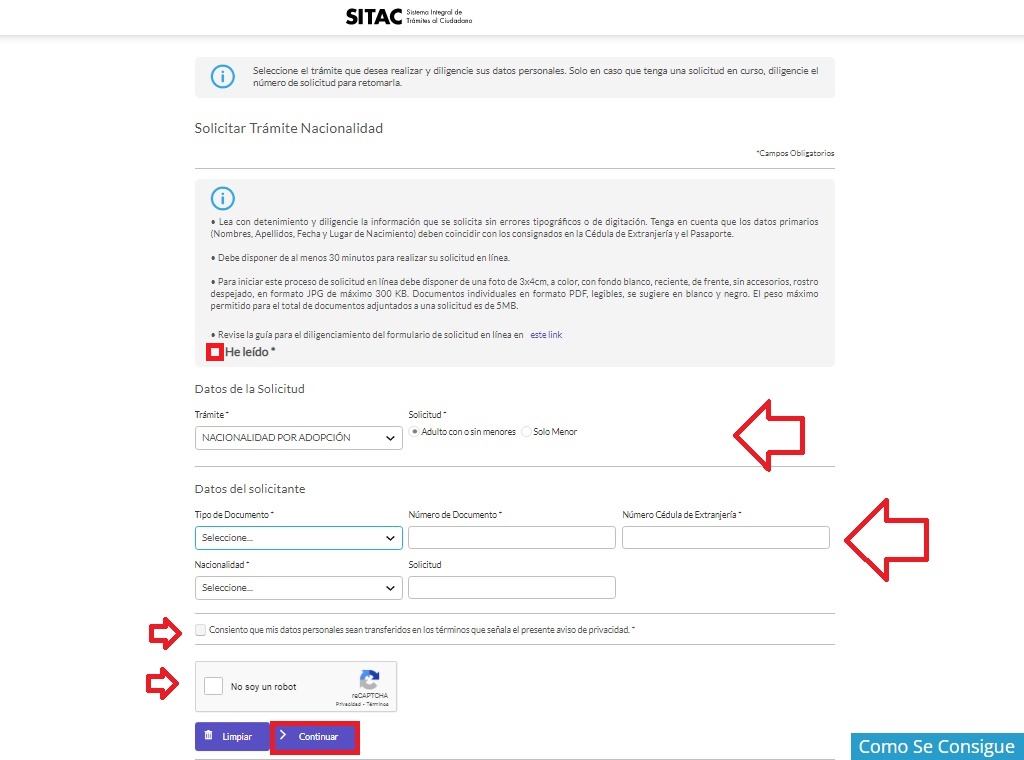 - Marca que aceptas el uso de tus datos personales, resuelve el reCAPTCHA y oprime “Continuar”.